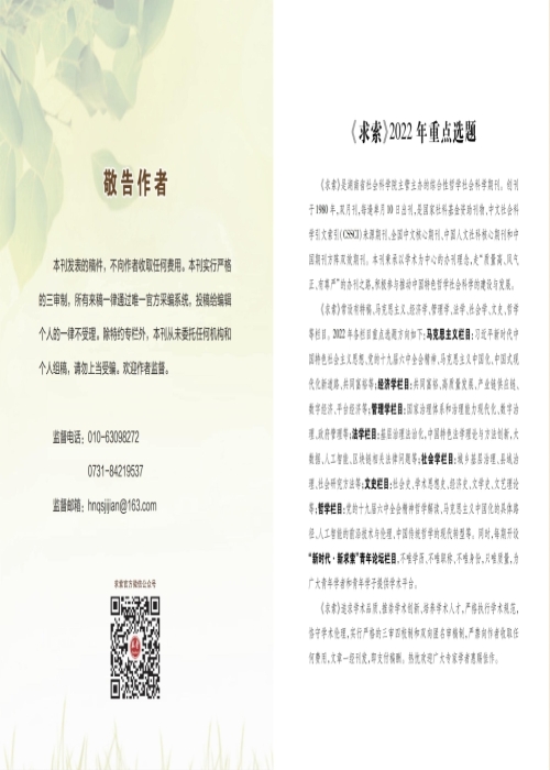 《求索》追求学术品质、推崇学术创新、培养学术人才,严格执行学术规范,恪守学术伦理,实行严格的三审四校制和双向匿名审稿制,严禁向作者收取任何费用,文章一经刊发,即支付稿酬。热忱欢迎广大专家学者惠赐佳作。